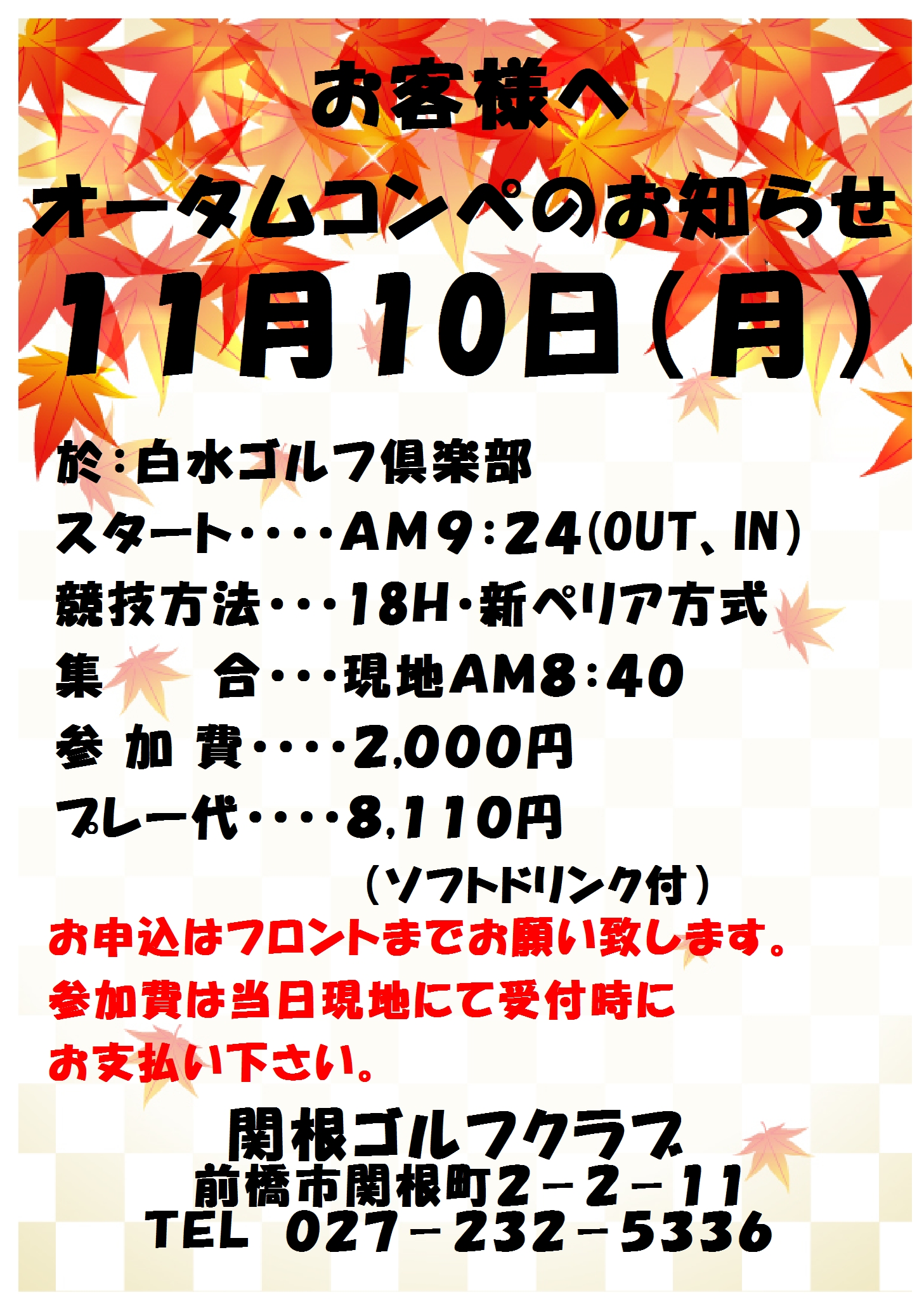 11月10日(月)白水ゴルフ倶楽部様にて、秋のコンペを開催いたします。
