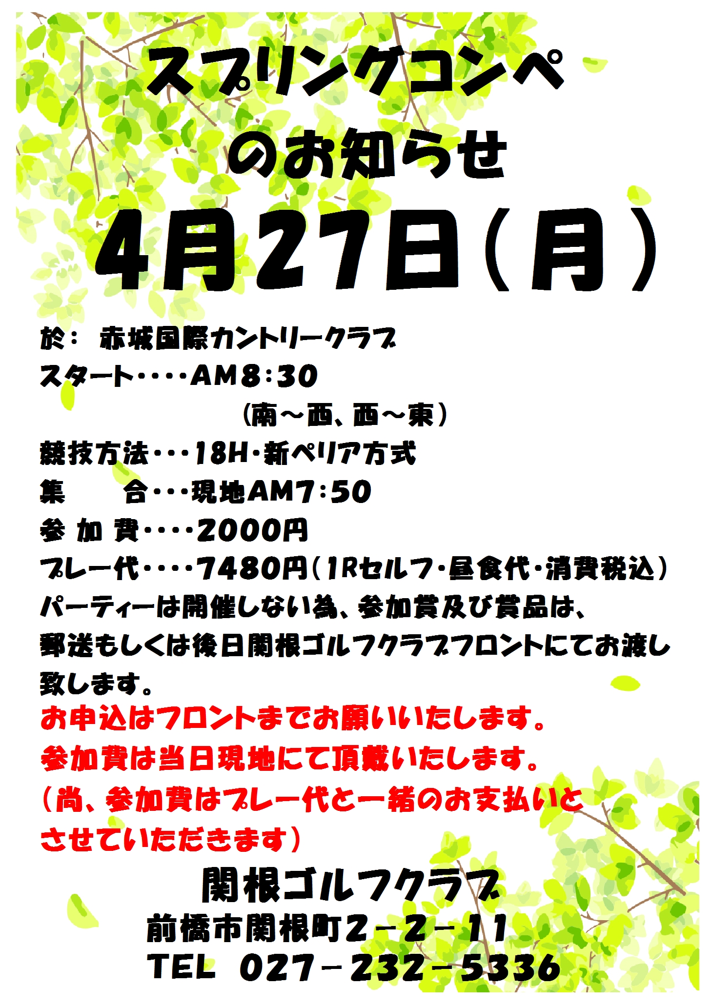 赤城国際CC様にて第105回関根ゴルフクラブ杯スプリングコンペを開催いたします。